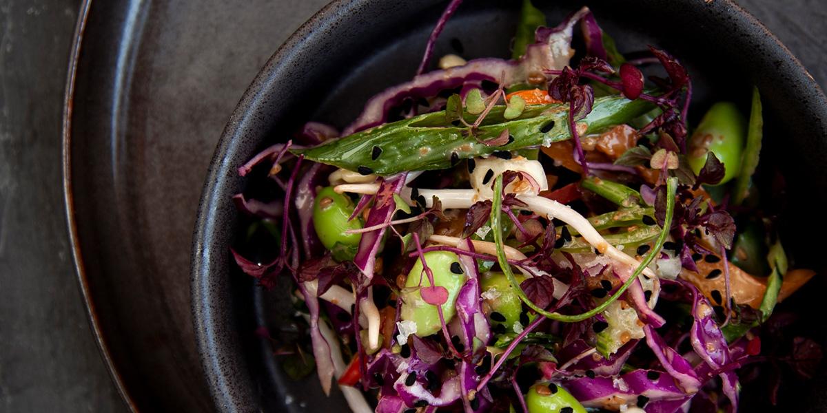 Crispy kylling med nudler, spinat, agurk, kokos og majs. Anrettet på dagens kål (1,2,7,8,10,11,15). Hertil karrydressing (2,6,13).