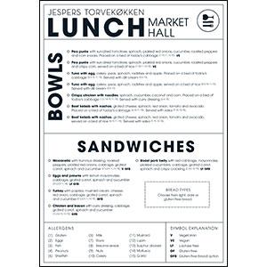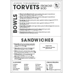 Udvalget i Torvets Frokostbod fornyes løbende i løbet af året, men hvis du vil se, hvad vi tilbyder i øjeblikket, kan du finde menuen herunder.