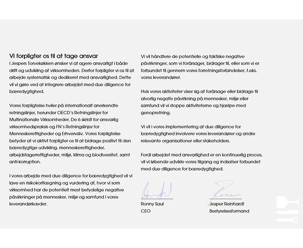 I Jespers Torvekøkken følger vi OECD's 6 skridt for ansvarlig virksomhedspraksis. Vi har i 2023 gennemført en Due Dilligence af Jespers Torvekøkken og Convi Food som en samlet koncern, og har kortlagt gennem en risikovurdering, på hvilke risikofaktorer der findes i vores værdikæde og hvordan vi håndterer negativ påvirkning på mennesker, miljø og klima på tværs.